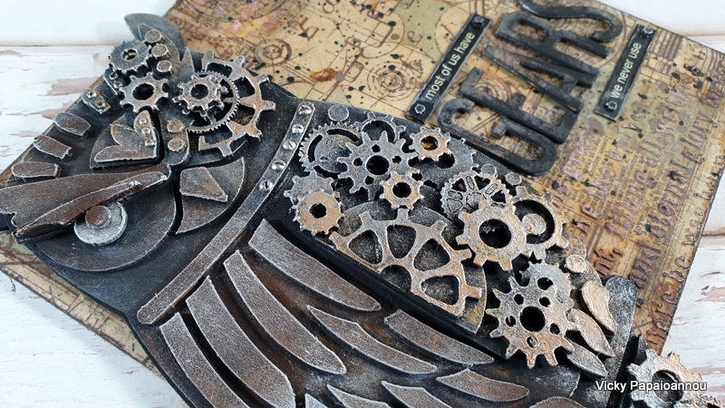 I’m not big into steam punk, but I absolutely LOVE this adorable and creative owl! WOW! And that quote is PERFECT with her!! I’ve not heard that saying before, but it’s so true for me. Thank you very much for talking about and demonstrating the dry brush technique. I’ve tried it a few times and although I like it there seemed to be something not quite right with it and I couldn’t understand what. Very dry brush (check), using small amounts of paint (check), and thick acrylic paint (missed that part and it makes a difference!!). And you even used rice paper!!!!! I’ve been curious about it and what to do with it since Stamperia has some gorgeous rice papers. What a fun project and I appreciate you sharing it. Thank you so much, Vicky! Have a safe and great weekend and may you enjoy your new craft room buddy!!!
