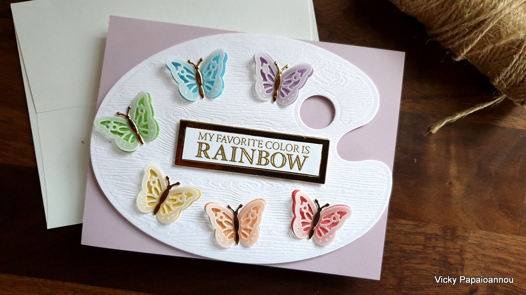Hi! Today I am sharing inpiration using the Painter’s Palette Die set ( SBC | SSS | SPL ) from my NEW Paint your world collection ( SBC | SPL | SSS ) for Spellbinders. The Painter’s palette set gives you lots of dies to play with including a big palette die, blobs of color, a paint tube and a paintbrush. The palette is big enough to create a shaped card and was designed to fit on top of a standard card.