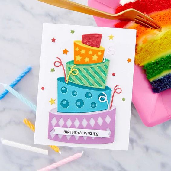 Spellbinders has just released birthday themed products including dies, embossing folders, stamps and stencil. In this Birthday Celebration release the Topsy Turvy Cake Dies were designed by me! The topsy turvy cake is also known as the wonderland cake or mad hatter cake. It has multiple layers, and each layer is skewed making it super fun.