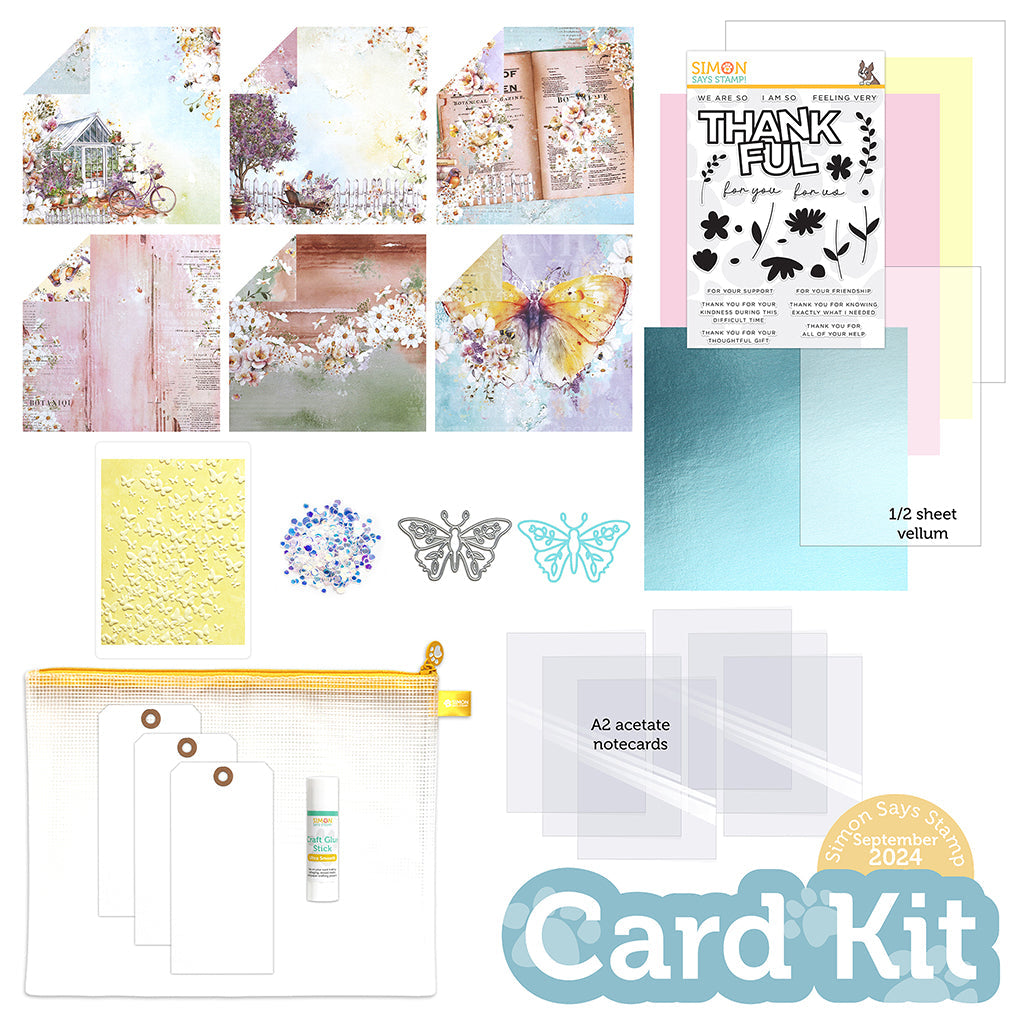 In the card kit this month you get papers, dies, embossing folder, stamps, a butterfly die and so much more!