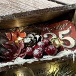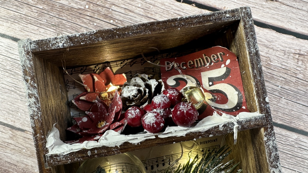 just use any mini ornaments, Christmas branches, tiny books, ephemera, bells … whatever you can fit! Anything goes!