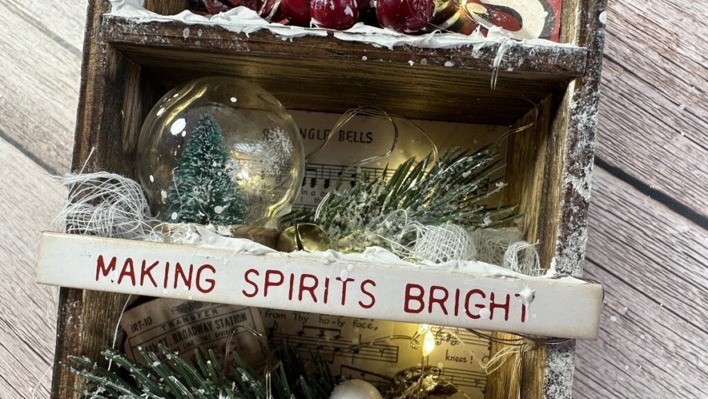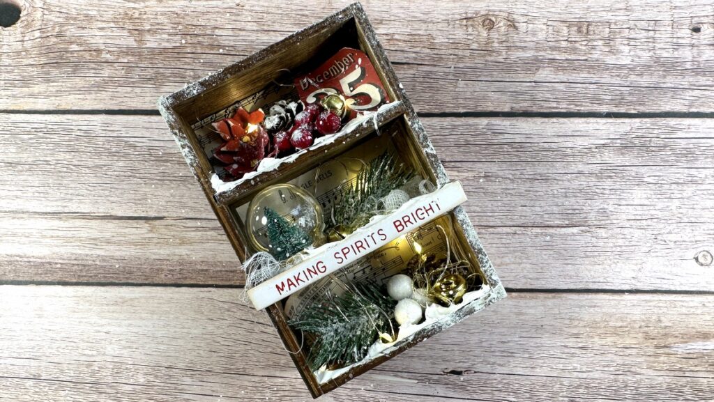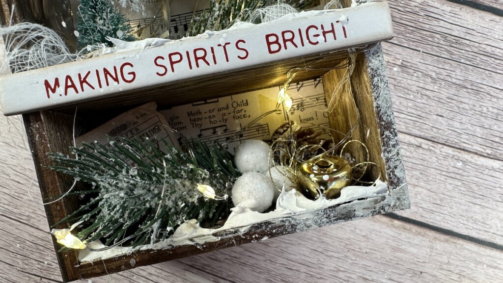 just use any mini ornaments, Christmas branches, tiny books, ephemera, bells … whatever you can fit! Anything goes!