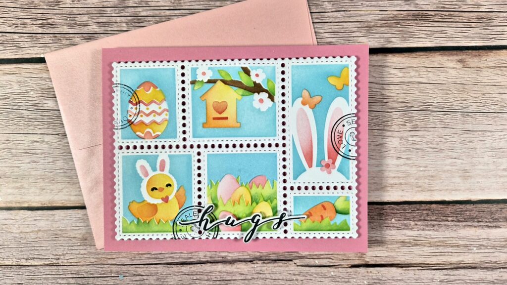 This design uses the Postage Collage Die combined with an egg hunt stencil set to create a multi-panel scene.