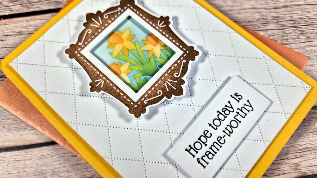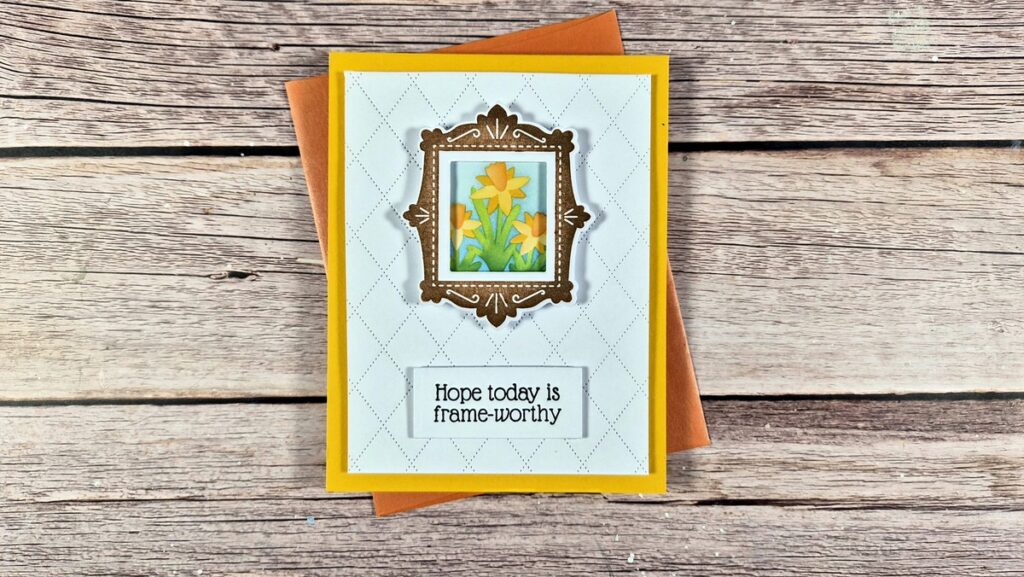 This second card focuses on a single “frame-worthy” image using a square stencil and decorative postal frame.