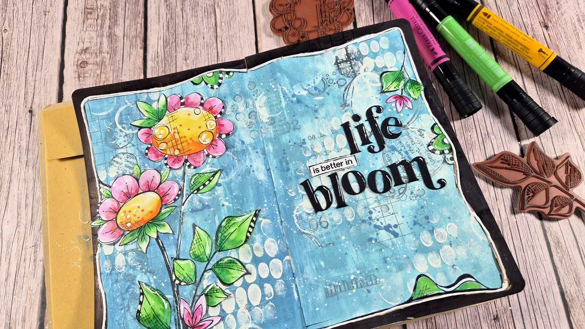 For the focal points, I used a favorite trick: applying Pitt Artist Pens over a dried layer of matte medium. This creates a non-porous surface that allows you to smudge the ink with your finger before it dries, giving a beautifully blended look similar to alcohol markers but with less effort. I finished the flowers with white gel pen highlights and acrylic markers for vibrant, opaque details.