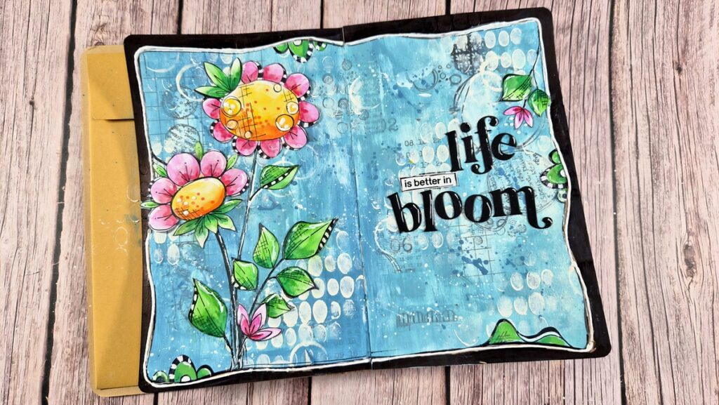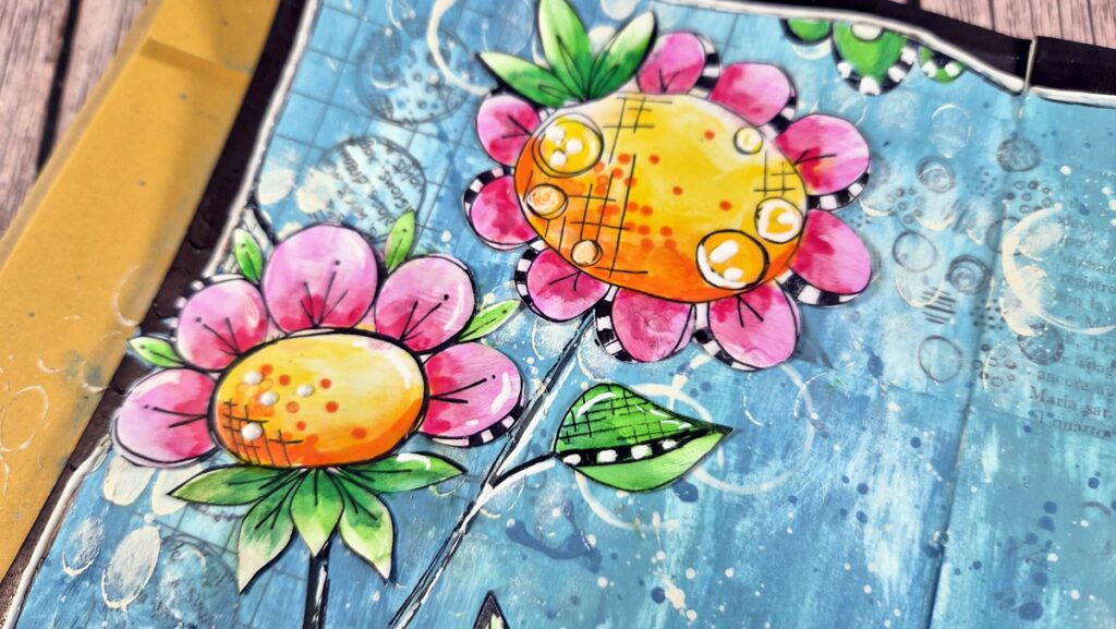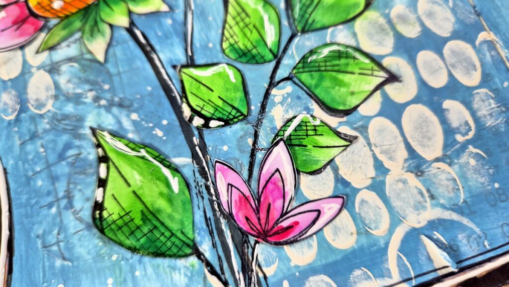 For the focal points, I used a favorite trick: applying Pitt Artist Pens over a dried layer of matte medium. This creates a non-porous surface that allows you to smudge the ink with your finger before it dries, giving a beautifully blended look similar to alcohol markers but with less effort. I finished the flowers with white gel pen highlights and acrylic markers for vibrant, opaque details.